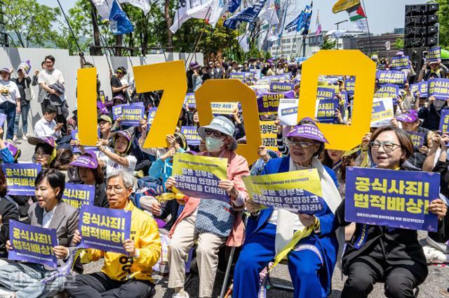 일본군 위안부 피해자 이용수 할머니를 비롯한 시민들이 14일 서울 종로구 주한일본대사관 앞 평화로에서 열린 ‘1700차 일본군 성노예제 문제 해결을 위한 정기 수요시위’에서 손팻말을 들고 있다. 심현철 기자 |