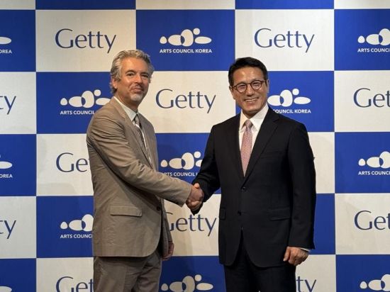22일 오전 종로 예술가의집에서 열린 기자간담회에서 한국문화예술위원회 전병국 위원장(오른쪽)과 게티연구소 부소장 앤드류 페르척이 악수하고 있다. 한국문화예술위원회 |