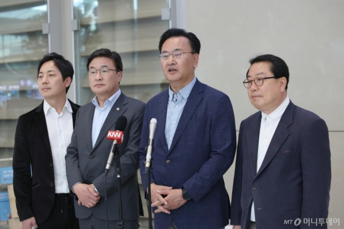 하와이에 체류 중인 홍준표 전 대구시장의 선대위 합류를 설득하기 위해 꾸려진 국민의힘 김문수 대통령 선거 후보 선거대책위원회 소속 유상범 단일화추진본부장과 김대식 대외협력본부장 등으로 구성된 하와이 특사단이 홍 전시장과 이틀간의 만남을 가진 뒤 21일 오후 인천국제공항 제2터미널을 통해 귀국하며 취재진의 질문에 답하고 있다. 2025.05.21. /사진=뉴시스 /사진=김금보 |