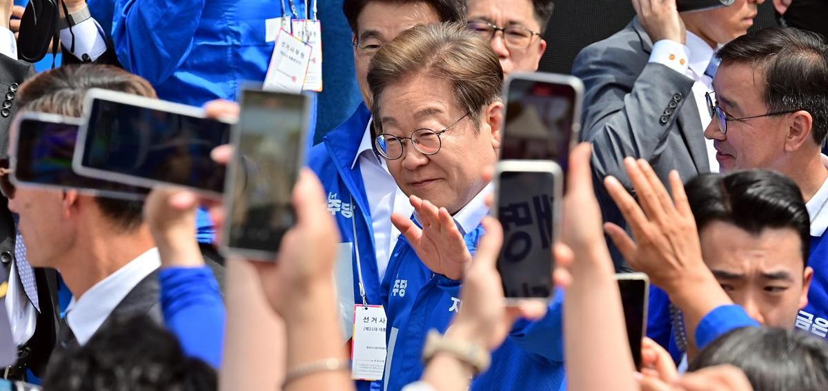 더불어민주당 이재명 대선 후보가 22일 오전 제주 동문시장 앞 탐라문화광장에 들어서자 지지자들이 휴대전화를 들고 사진을 찍고 있다. 이 후보는 이날 제주를 거쳐 경남 양산시로 이동해 집중 유세를 진행했다. 제주=뉴스1 |