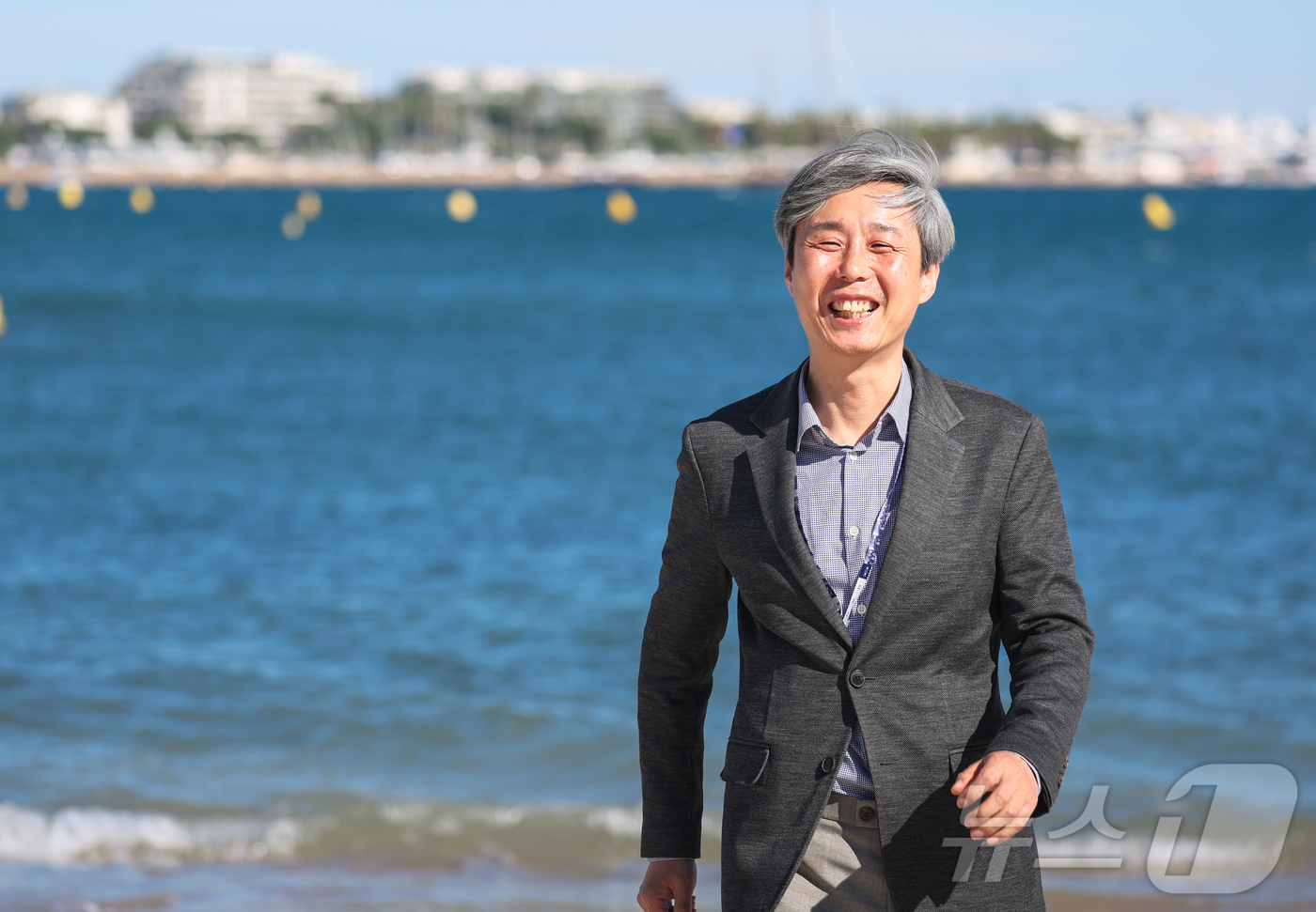 (파리=뉴스1) 이준성 기자 = 22일 제78회 칸 국제영화제가 열리고 있는 프랑스 남부 소도시 칸(Cannes) 영화진흥위원회 부스 인근 크루아제트 해변에서 조근식 한국영화아카데미(KAFA) 원장이 인터뷰 촬영을 하고 있다. 2025.5.23/뉴스1