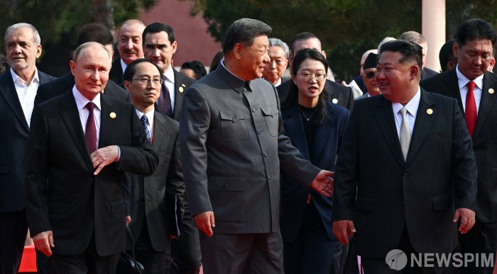 시진핑 중국 국가주석(가운데)과 김정은 북한 국무위원장(오른쪽), 블라디미르 푸틴 러시아 대통령이 3일 중국 베이징 천안문 광장에서 열린 전승절 80주년 열병식에 참석하고 있다. [사진=로이터 뉴스핌] |
