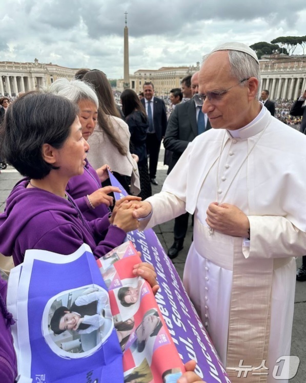 (서울=뉴스1) 신웅수 기자 = 이태원 참사 유가족인 고(故) 이상은 씨의 아버지 이성환 씨와 어머니 강선이 씨가 21일(현지시간) 바티칸 성 베드로 광장에서 열린 레오 14세 교황을 알현하고 있다. (이태원참사 유가족협의회 제공. 재판매 및 DB 금지) 2025.5.23/뉴스1