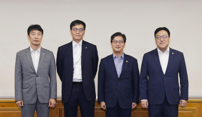 김범석 기획재정부 장관 직무대행 1차관이 23일 오전 서울 중구 은행회관에서 열린 '거시경제·금융현안 간담회'에 앞서 기념촬영을 하고 있다. 왼쪽부터 이복현 금융감독원장, 이창용 한국은행 총재, 김 직무대행, 김병환 금융위원장./사진제공=기재부 |