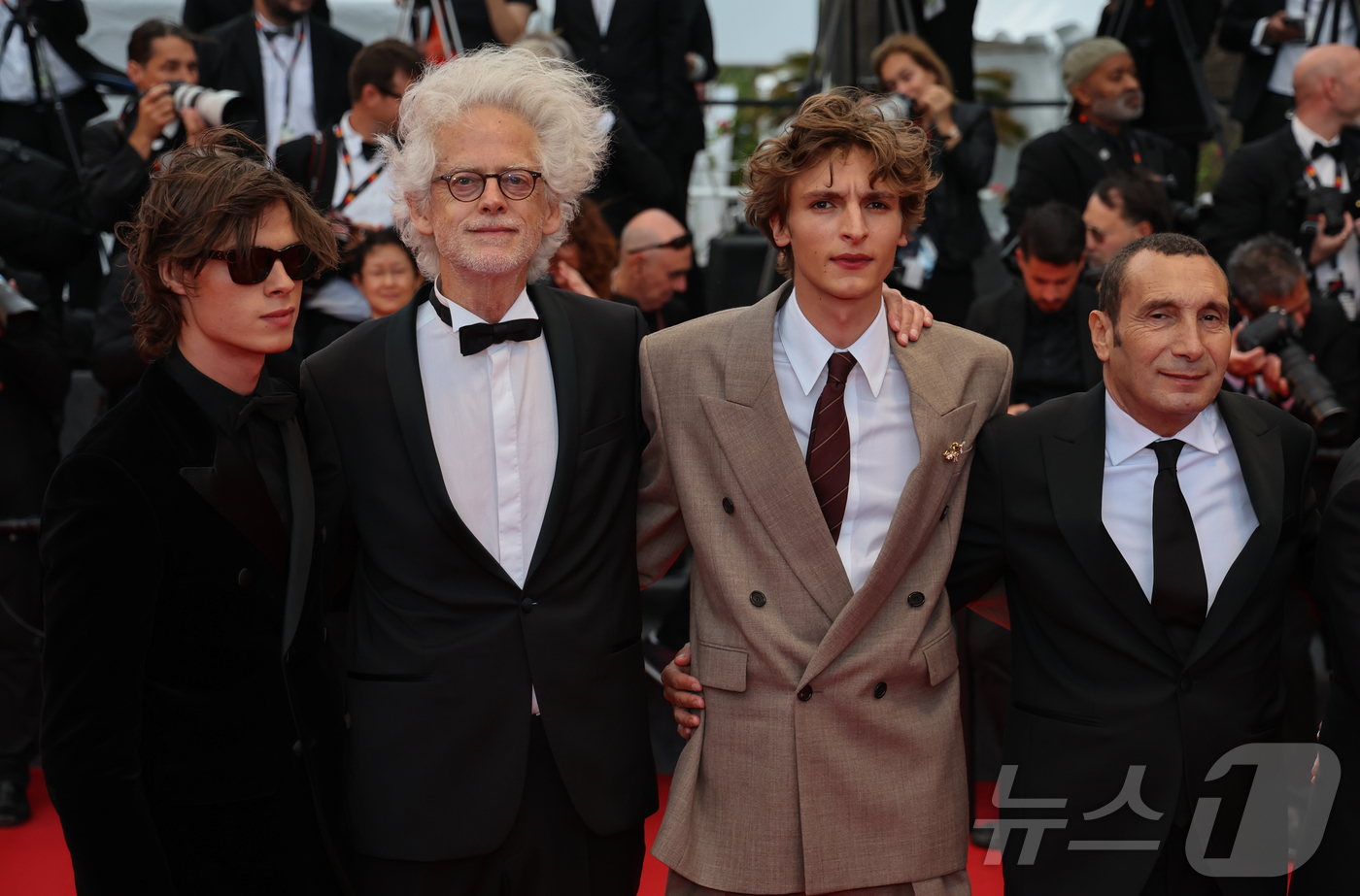 (파리=뉴스1) 이준성 기자 = 22일(현지시간) 프랑스 남부 소도시 칸(Cannes) 팔레 데 페스티발(Palais des Festival) 뤼미에르 대극장에서 열린 ‘제78회 칸 국제영화제’ 비경쟁부문 진출작 영화 ‘컬러스 오브 타임 (원제 LA VENEU DE L’AVENIR)’ 월드 프리미어 시사회에서 출연배우 바실리 슈나이데르(왼쪽 두번째)와 지네딘 수알렘(오른쪽), 폴 키르셰르(왼쪽)이 레드 카펫에 올라 포즈를 취하고 있다. 2025.5.23/뉴스1