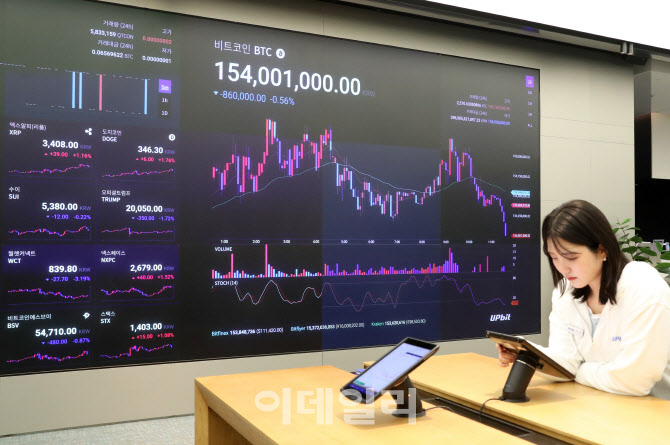 [이데일리 김태형 기자] 23일 서울 강남구 암호화폐거래소 업비트에서 관계자가 비트코인 등 가상자산 시황을 살펴보고 있다.