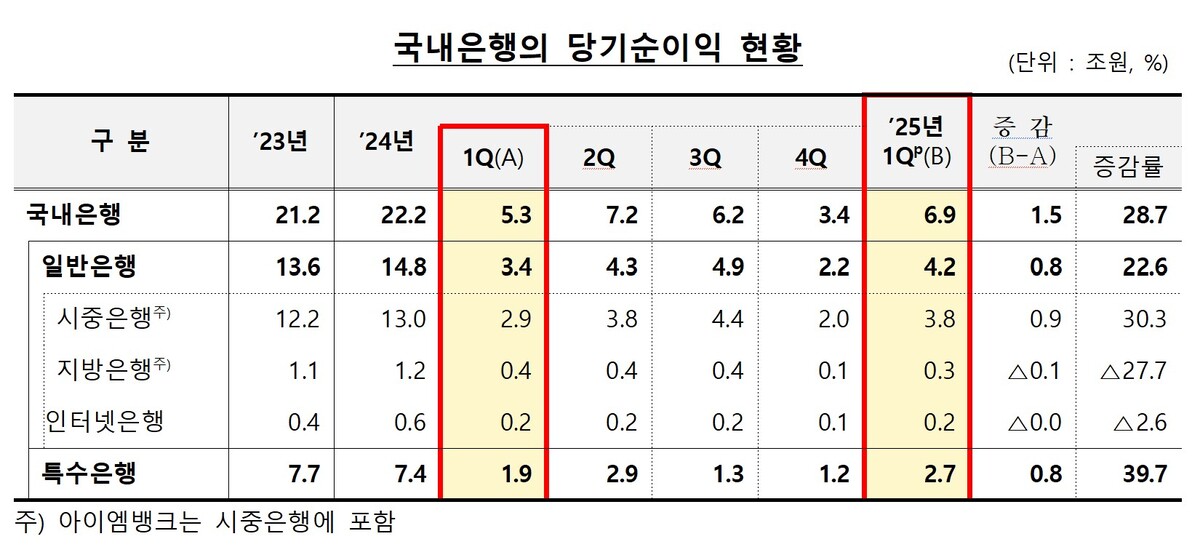 23일 금융감독원이 발표한 2025년 1분기 국내은행 영업실적에 따르면 시중은행은 전년 동기 대비 30.3% 증가한 3조8000억원, 특수은행들은 39.7% 늘어난 2조7000억원의 순이익을 각각 냈다. 반면 지방은행은 27.7% 감소한 3000억원, 인터넷은행은 2.6% 줄어든 2000억원의 순이익을 내는데 그쳤다.