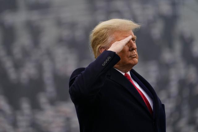도널드 트럼프 미국 대통령이 집권 1기 당시인 2020년 12월 12일 뉴욕주 웨스트포인트의 미 육군사관학교 캠퍼스 내 경기장 미치스타디움에서 제121회 육군·해군 미식축구 경기가 열리기 전 거수 경례를 하고 있다. AP 연합뉴스 자료사진 |