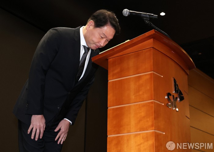 [서울=뉴스핌] 양윤모 기자 = 최태원 SK그룹 회장이 지난 7일 오전 서울 중구 SK텔레콤 T타워 SUPEX홀에서 열린 해킹 사태 관련 일일 브리핑에 참석해 해킹 사고 이후 19일 만에 고개숙여 대국민 사과를 하고 있다. [공동취재] 2025.05.07 yym58@newspim.com |