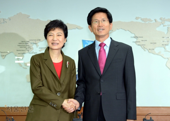 박근혜(왼쪽) 전 대통령과 김문수 국민의힘 대선 후보가 2012년 10월 경기도청에서 만나 악수하고 있다. 서울신문DB |
