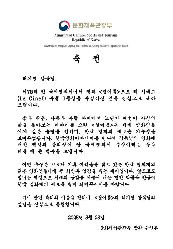 유 장관은 축전을 통해 "삶과 죽음, 가족과 사랑 사이에서 노년기 여성이 자신의 삶을 돌아보는 이야기를 그린 '첫여름'은 세계 영화인들에게 깊은 울림을 전하며, 한국 영화의 새로운 가능성을 보여줬다"고 밝혔다.