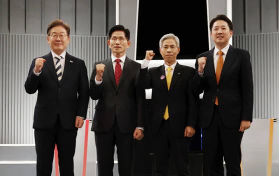 오늘(23일) 서울 KBS스튜디오에서 제21대 대선 2차 후보자 토론회가 열렸다. 토론회 시작 전 기념 촬영을 한 대선 후보들. 왼쪽부터 더불어민주당 이재명·국민의힘 김문수·민주노동당 권영국·개혁신당 이준석 후보. 〈사진=국회사진기자단·연합뉴스〉 |