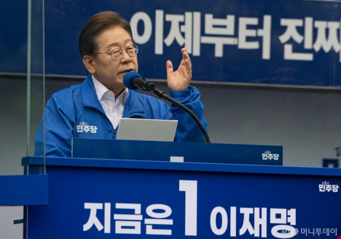 [양산=뉴시스] 조성우 기자 = 이재명 더불어민주당 대선후보가 22일 경남 양산시 양산워터파크공원에서 열린 집중유세에서 연설하고 있다. (공동취재) 2025.05.22. photo@newsis.com /사진=조성우 |