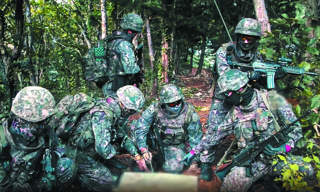 8명 내외로 구성된 분대는 사전 작전 계획대로 돌격·돌파·화력지원 등 역할을 나눠 작전을 수행했다. 돌파조는 장애물 개척 및 통로 확보를 위해 나갔고 후방에서는 화력지원조가 아군을 엄호했다. “쾅~!” 그때 폭음탄이 통로 우측에서 굉음을 내며 터졌다. 적군의 포탄 낙하 상황을 가정한 것이다. 분대는 이에 아랑곳하지 않고 침착하게 전투를 이어갔다.