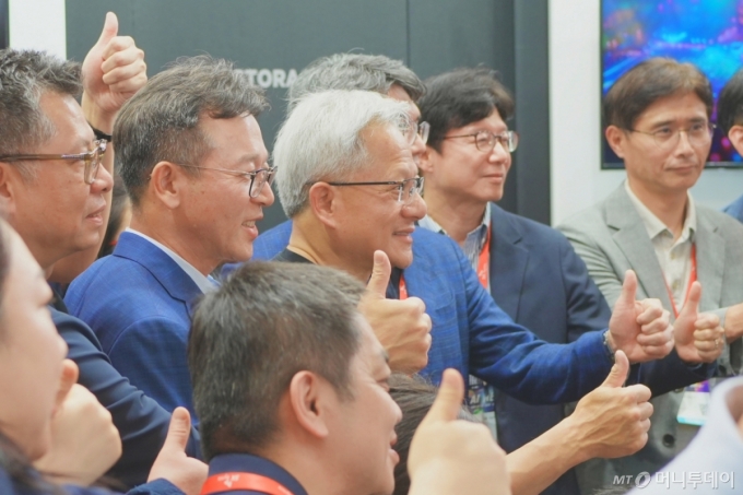 젠슨 황 엔비디아 CEO가 20일 대만에서 열린 '컴퓨텍스 2025' SK하이닉스 전시관을 찾아 SK하이닉스 직원들과 기념사진을 찍고 있다. /사진=김남이 기자 |