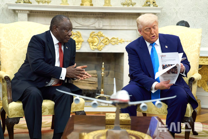 [워싱턴=AP/뉴시스] 도널드 트럼프(오른쪽) 미국 대통령이 21일(현지 시간) 백악관 집무실에서 시릴 라마포사 남아공 대통령과 회담하면서 자료를 공개하고 있다. 트럼프 대통령은 회담 중 남아공의 '백인 농부 집단 살해' 의혹을 공개적으로 제기, 해명을 요구하면서 정상 간 공방이 이어졌다. 2025.05.22. |