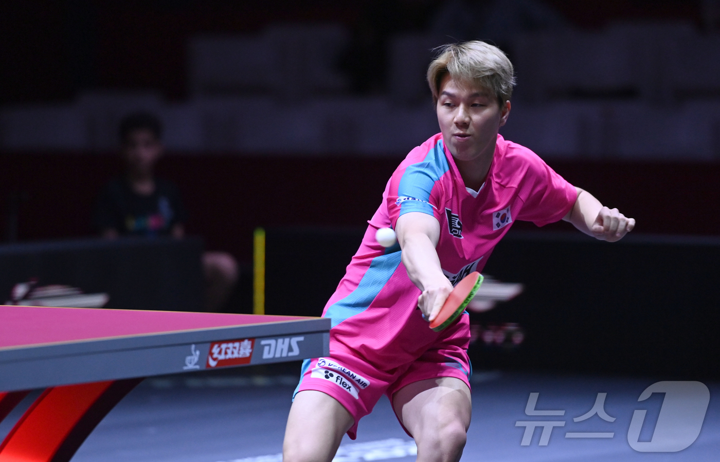 (도하(카타르)=뉴스1) 사진공동취재단 = 안재현이 23일 카타르 도하 루사일 아레나에서 열린 2025 국제탁구연맹(ITTF) 세계선수권대회 남자단식 8강 브라질 휴고 칼데라노와 경기를 펼치고 있다. 2025.5.24/뉴스1