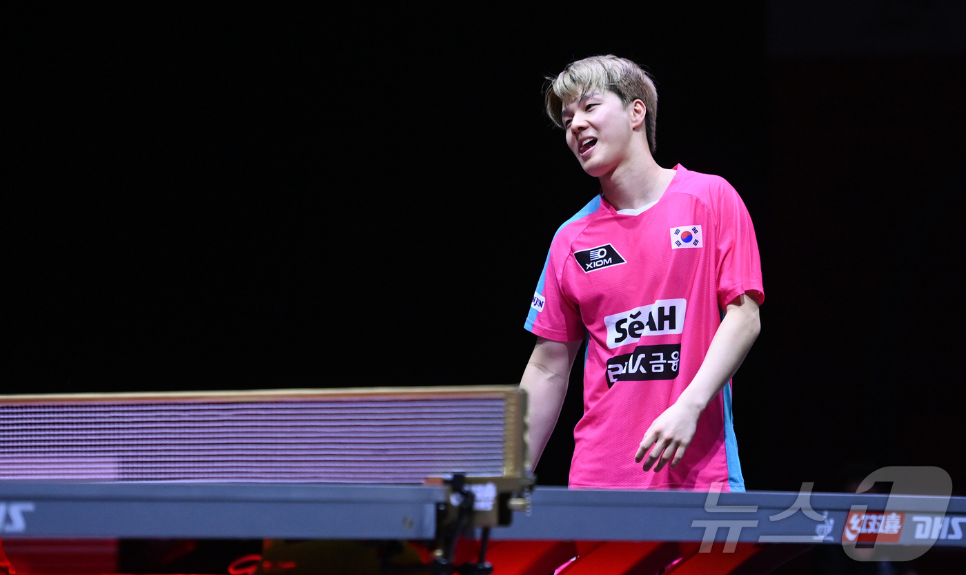 (도하(카타르)=뉴스1) 사진공동취재단 = 안재현이 23일 카타르 도하 루사일 아레나에서 열린 2025 국제탁구연맹(ITTF) 세계선수권대회 남자단식 8강 브라질 휴고 칼데라노와 경기 패배 후 아쉬워하고 있다. 2025.5.24/뉴스1