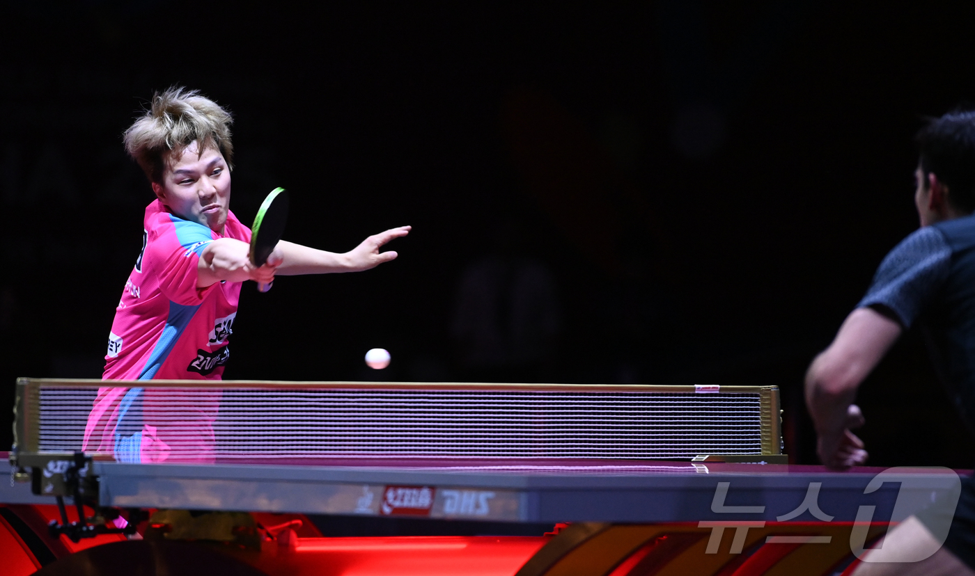 (도하(카타르)=뉴스1) 사진공동취재단 = 안재현이 23일 카타르 도하 루사일 아레나에서 열린 2025 국제탁구연맹(ITTF) 세계선수권대회 남자단식 8강 브라질 휴고 칼데라노와 경기를 펼치고 있다. 2025.5.24/뉴스1