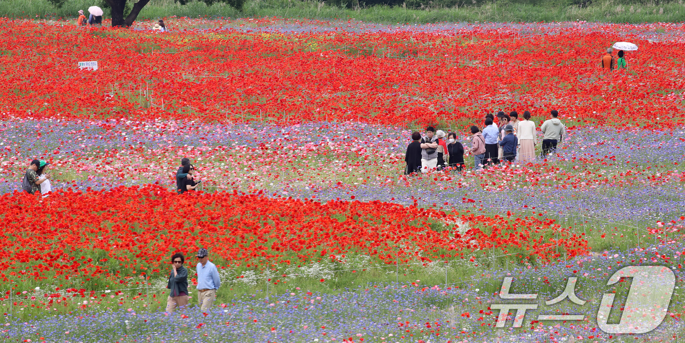 초여름 더위가 한풀 꺾이고 선선한 날씨를 보인 23일 경남 함안군 악양둑방 둔치에 조성된 봄꽃 경관단지를 찾은 관광객들이 활짝 핀 양귀비와 수레국화를 감상하고 있다./뉴스1 ⓒ News1 윤일지 기자 |