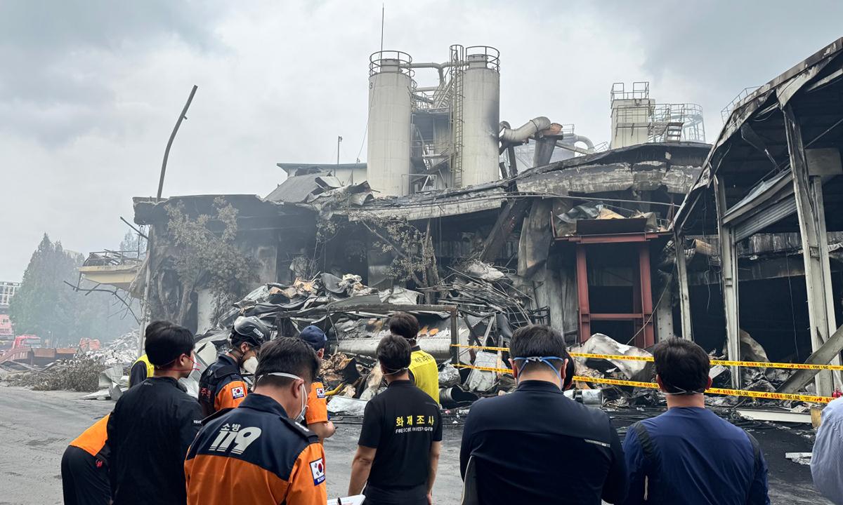 소방청이 주축인 중앙화재합동조사단이 지난 21일 금호타이어 광주 공장 화재 현장을 살펴보고 있다. 소방청 제공 |