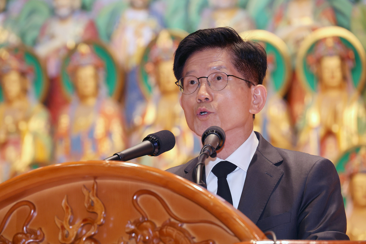 김문수 국민의힘 대선 후보가 24일 충북 단양군 구인사에서 열린 상월원각대조사 제51주기 열반대재에서 추도사를 하고 있다. [연합] |