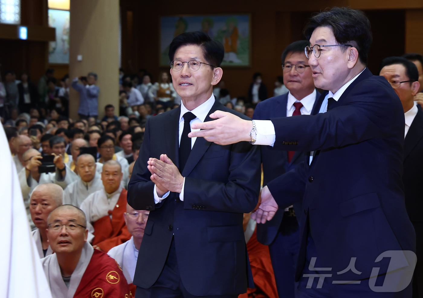 김문수 국민의힘 대통령 후보가 24일 충북 단양군 구인사에서 열린 상월원각대조사 제51주기 열반대재에 참석하고 있다. 오른쪽은 권성동 공동선대위원장. 2025.5.24/뉴스1 ⓒ News1 김민지 기자 |