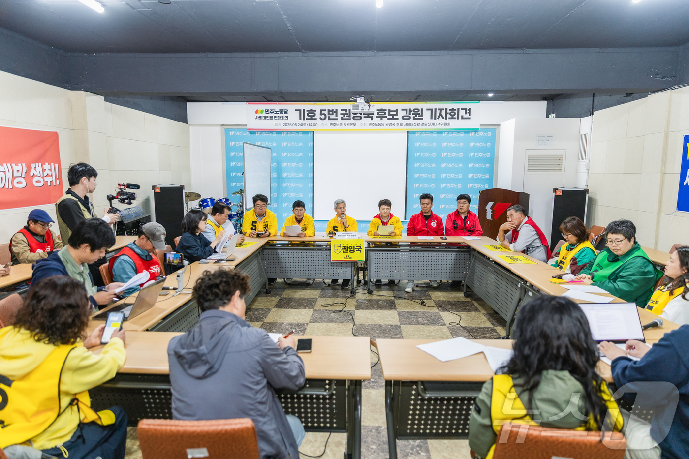 (춘천=뉴스1) 이종재 기자 = 권영국 민주노동당 대통령 후보가 24일 춘천을 찾아 기자회견을 하고 있다. (민주노동당 제공. 재판매 및 DB금지) 2025.5.24/뉴스1