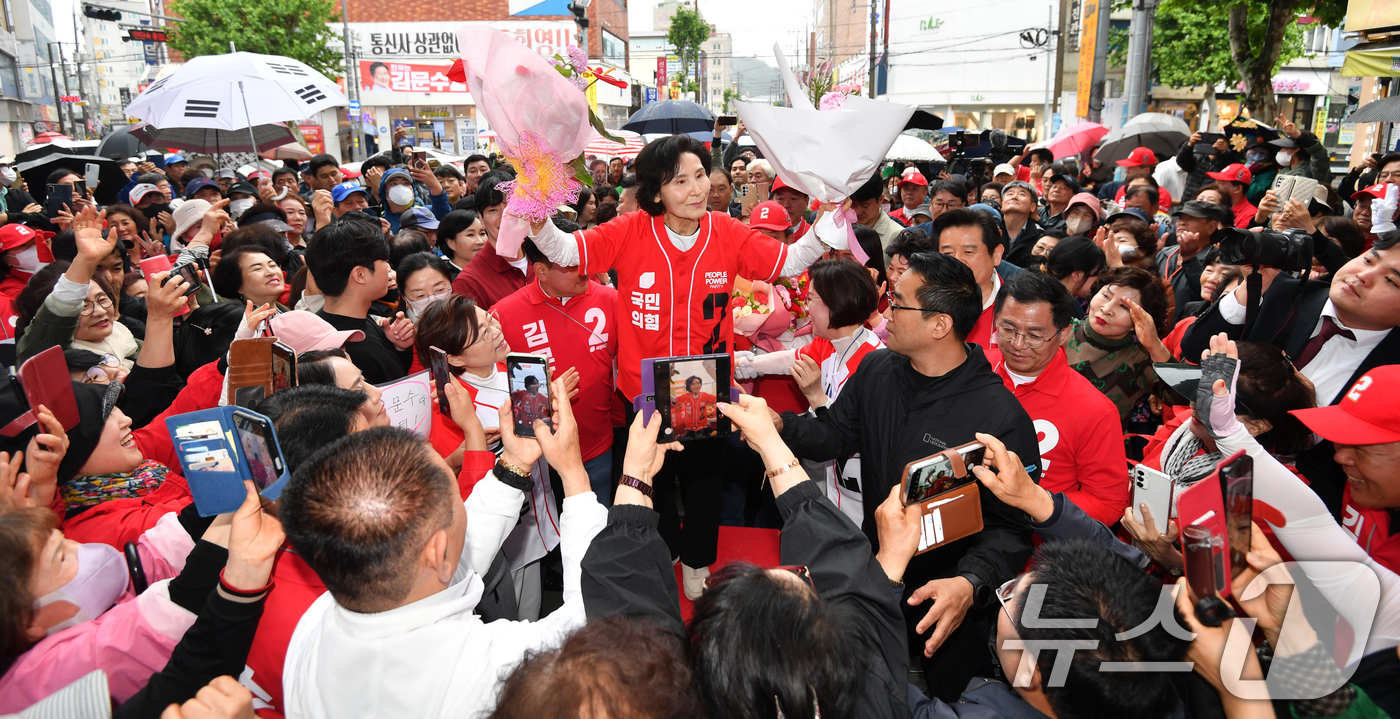 (포항=뉴스1) 최창호 기자 = 김문수 국민의힘 대통령 후보 배우자 설난영 여사가 24일 오후 경북 포항시 죽도시장 입구에서 지지자들로부터 꽃다발을 받은 후 인사를 나누고 있다. 2025.5.24/뉴스1