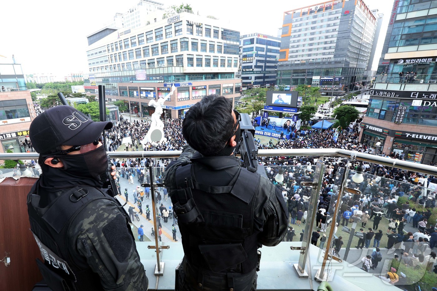(시흥=뉴스1) 이승배 기자 = 이재명 더불어민주당 대선 후보가 24일 경기 시흥 배곧아브뉴프랑 센트럴광장에서 유세를 하고 있는 가운데 경찰특공대가 드론재밍건을 든 경찰특공대가 경계근무를 서고 있다. (공동취재) 2025.5.24/뉴스1
