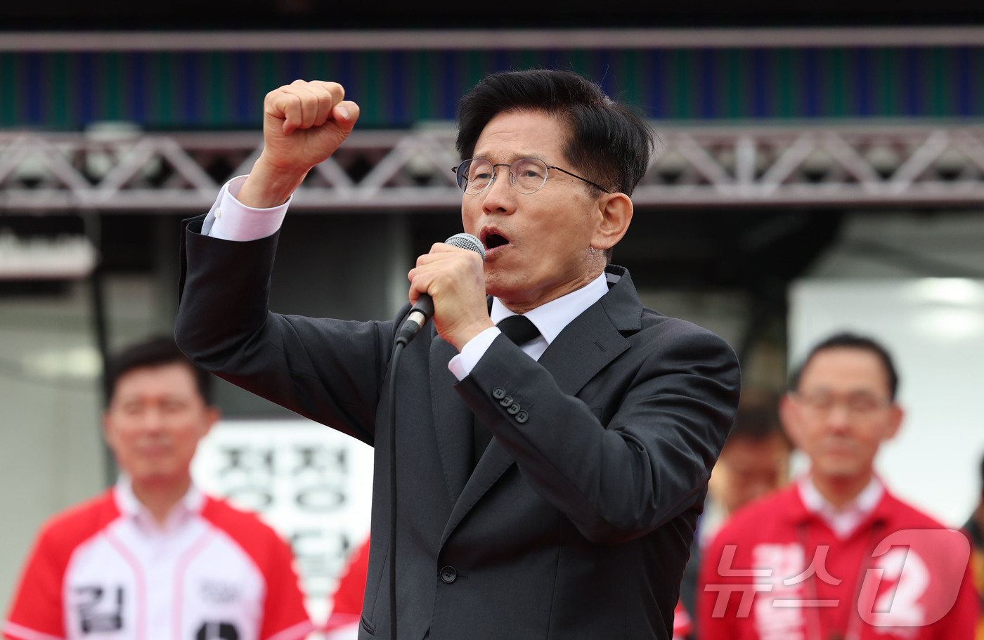 (구미=뉴스1) 김민지 기자 = 김문수 국민의힘 대통령 후보가 24일 경북 구미시 박정희 전 대통령 생가 인근에서 집중유세를 하고 있다. (공동취재) 2025.5.24/뉴스1