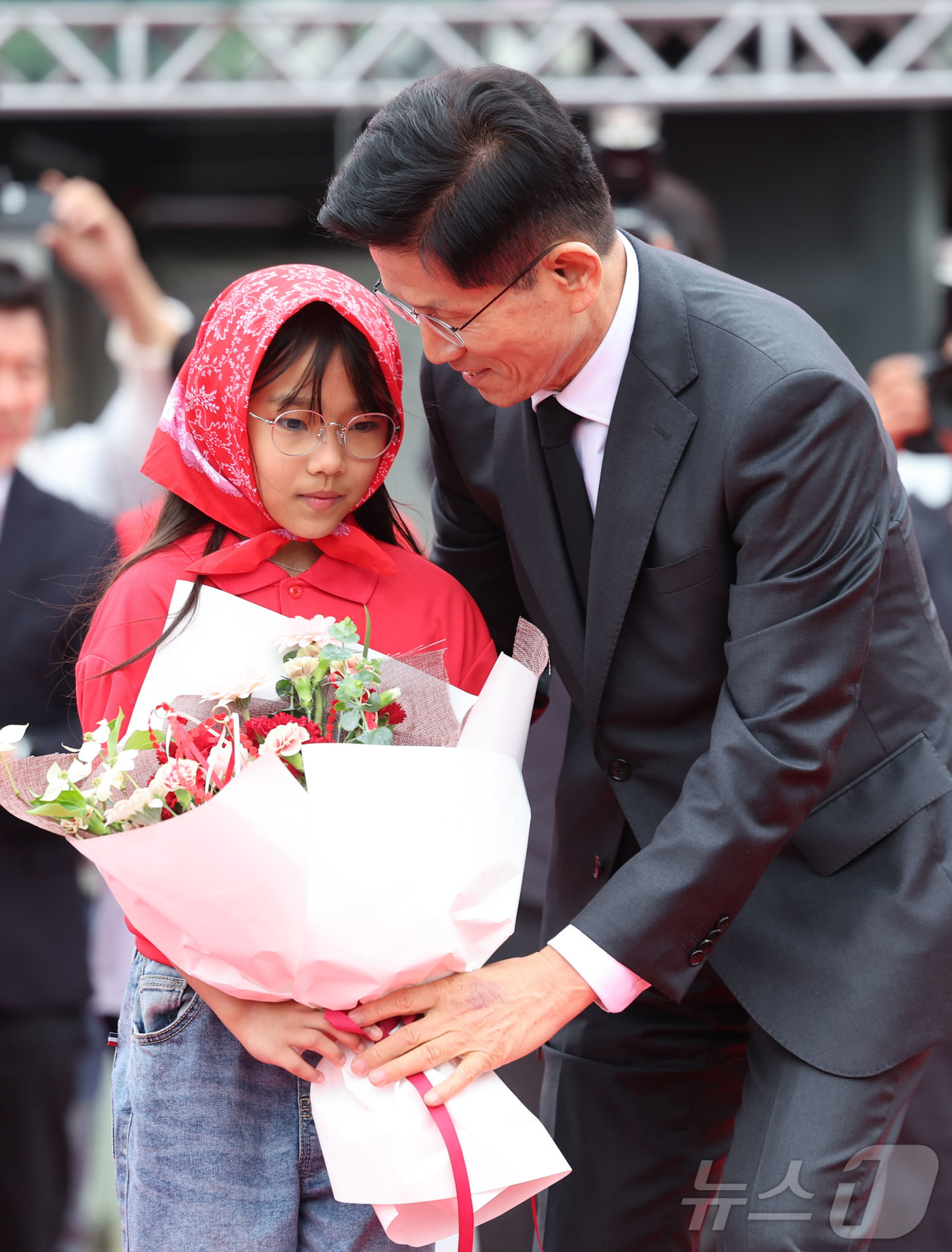 (구미=뉴스1) 김민지 기자 = 김문수 국민의힘 대통령 후보가 24일 경북 구미시 박정희 전 대통령 생가 인근에서 열린 집중유세에서 어린이에게 꽃다발을 받고 있다. (공동취재) 2025.5.24/뉴스1