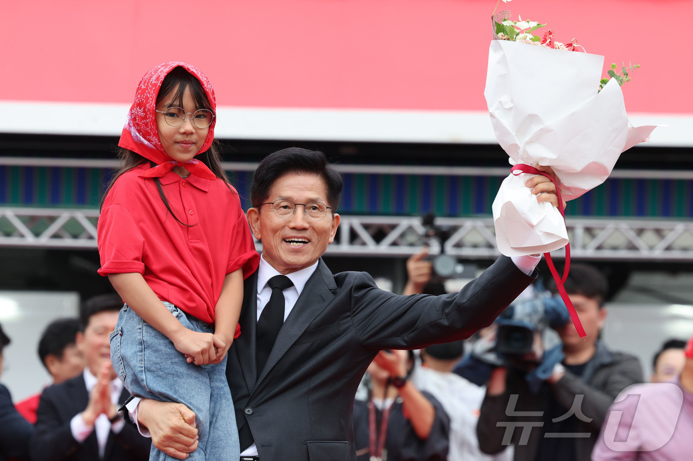(구미=뉴스1) 김민지 기자 = 김문수 국민의힘 대통령 후보가 24일 경북 구미시 박정희 전 대통령 생가 인근에서 열린 집중유세에서 어린이를 안아 들고 있다. (공동취재) 2025.5.24/뉴스1