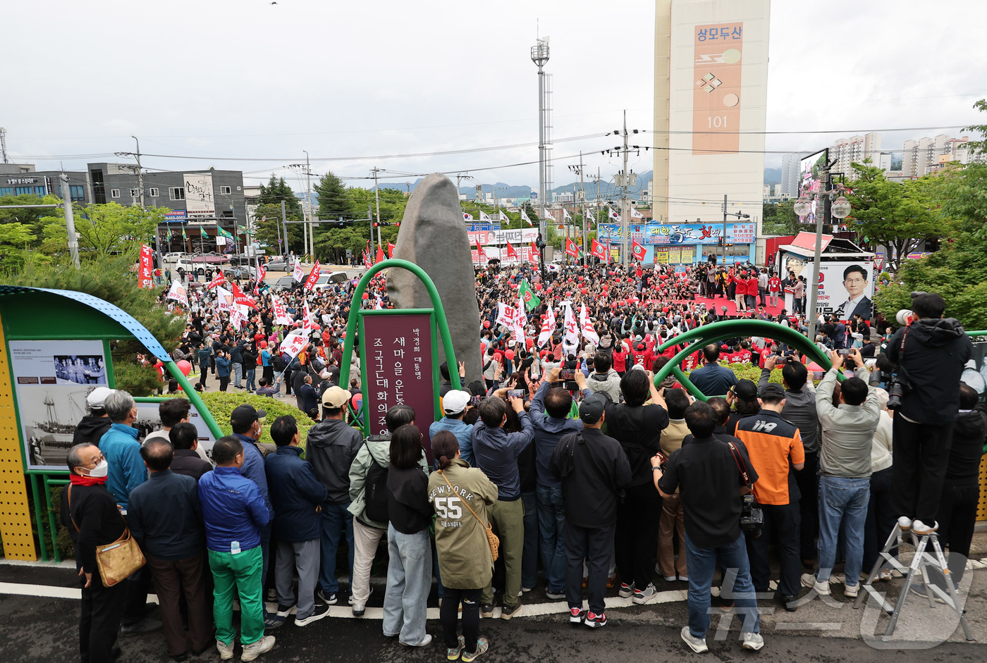 (구미=뉴스1) 김민지 기자 = 김문수 국민의힘 대통령 후보가 24일 경북 구미시 박정희 전 대통령 생가 인근에서 집중유세를 하고 있다. (공동취재) 2025.5.24/뉴스1