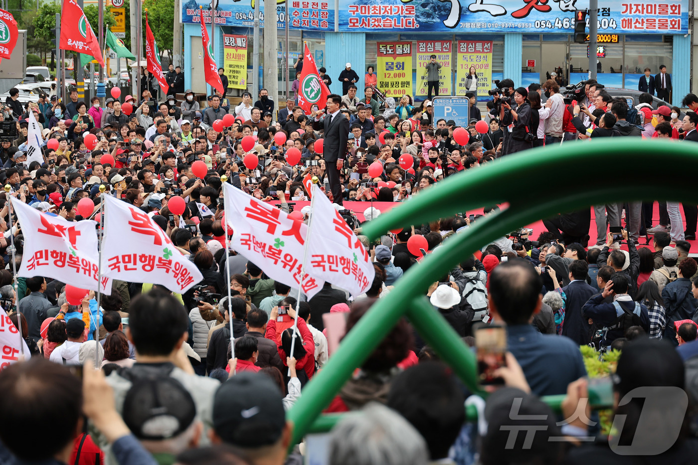 (구미=뉴스1) 김민지 기자 = 김문수 국민의힘 대통령 후보가 24일 경북 구미시 박정희 전 대통령 생가 인근에서 집중유세를 하고 있다. (공동취재) 2025.5.24/뉴스1