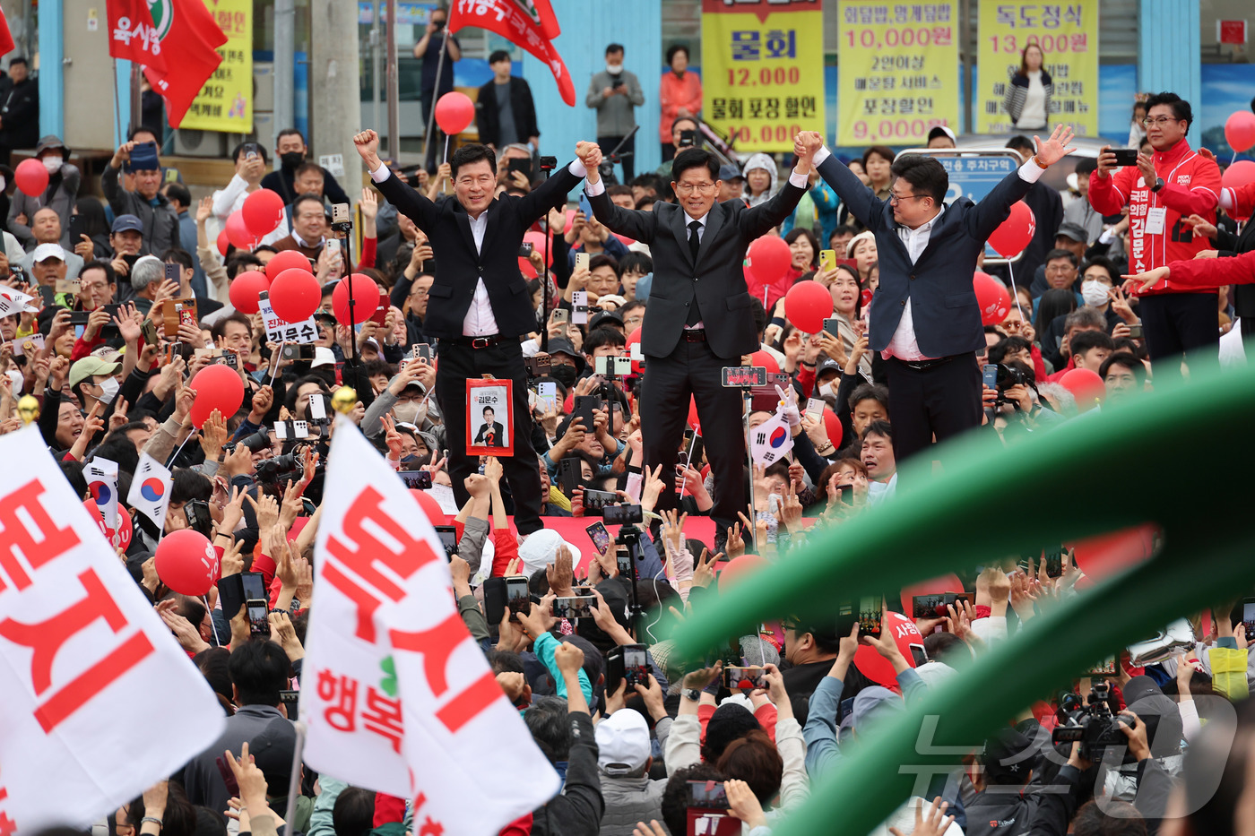 (구미=뉴스1) 김민지 기자 = 김문수 국민의힘 대통령 후보가 24일 경북 구미시 박정희 전 대통령 생가 인근에서 집중유세를 하고 있다. (공동취재) 2025.5.24/뉴스1