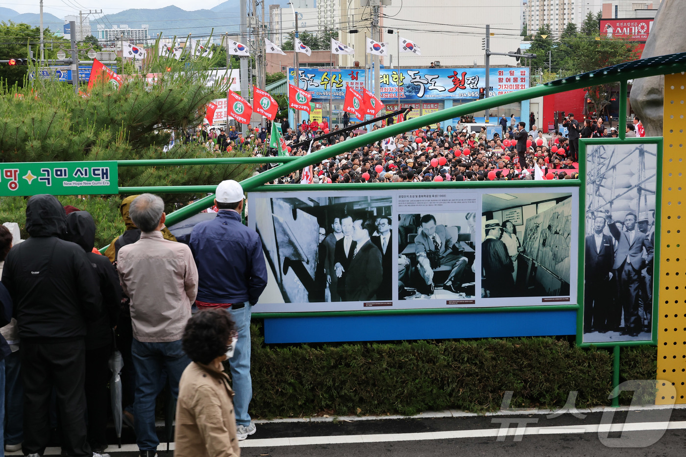 (구미=뉴스1) 김민지 기자 = 김문수 국민의힘 대통령 후보가 24일 경북 구미시 박정희 전 대통령 생가 인근에서 집중유세를 하고 있다. (공동취재) 2025.5.24/뉴스1