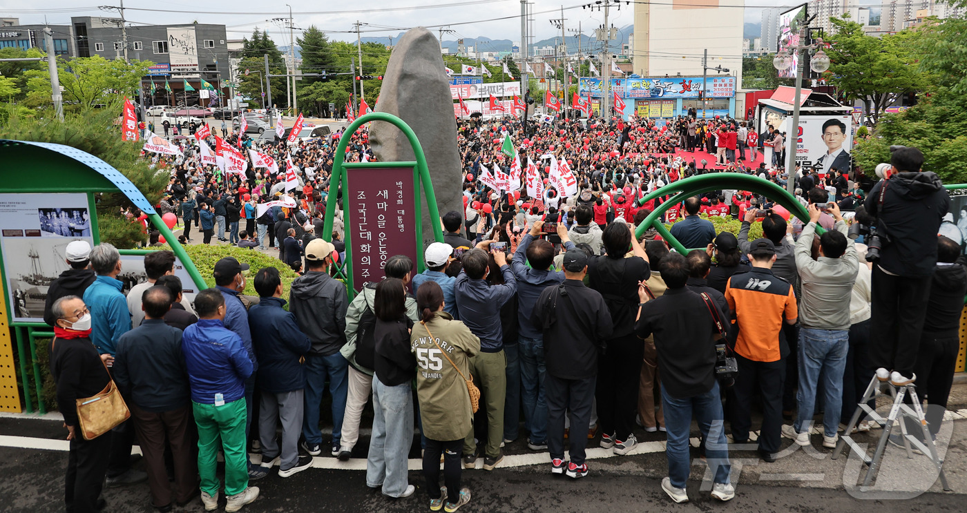 (구미=뉴스1) 김민지 기자 = 김문수 국민의힘 대통령 후보가 24일 경북 구미시 박정희 전 대통령 생가 인근에서 집중유세를 하고 있다. (공동취재) 2025.5.24/뉴스1