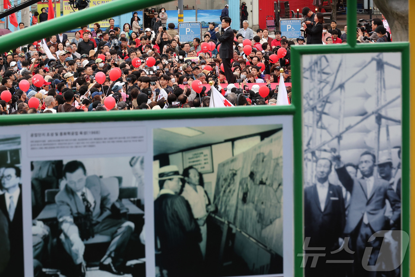 (구미=뉴스1) 김민지 기자 = 김문수 국민의힘 대통령 후보가 24일 경북 구미시 박정희 전 대통령 생가 인근에서 집중유세를 하고 있다. (공동취재) 2025.5.24/뉴스1