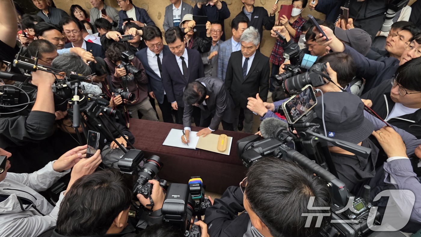 (구미=뉴스1) 정우용 기자 = 김문수 국민의힘 대통령 후보가 24일 경북 구미시 박정희 전 대통령 생가를 찾아 참배를 마친 뒤 방명록을 작성하고 있다. 2025.5.24/뉴스1