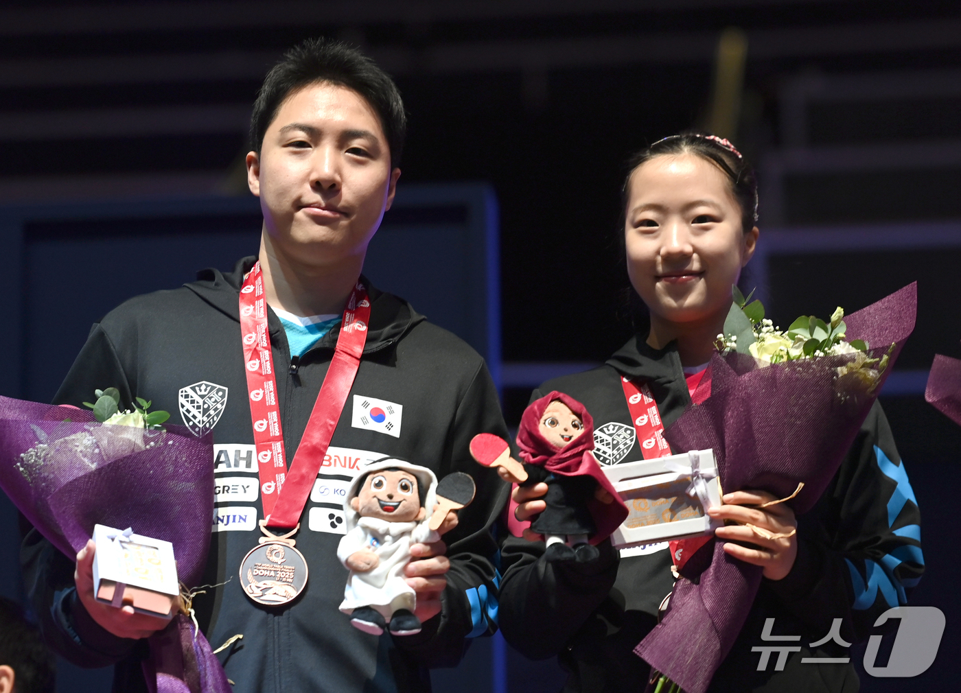 임종훈-신유빈 듀오는 지난 23일(이하 한국시간) 카타르 도하 루사일 아레나에서 열린 2025 세계탁구선수권 혼합복식 4강전에서 왕추친-쑨잉사(중국) 조에 패배, 동메달을 확정했다. 둘은 24일 열린 왕추친-쑨잉사와 요시무라 마하루-오도 사츠키(일본)의 결승전이 끝난 직후 열린 시상식에서 동메달을 받아들었다.