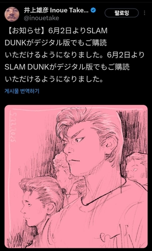25일 만화계에 따르면 '슬램덩크'를 그린 이노우에 다케히코(井上雄彦) 작가는 최근 자신의 엑스(X·구 트위터) 계정을 통해 "6월 2일부터 '슬램덩크'를 디지털판으로도 구독할 수 있게 됐다"고 밝혔다.