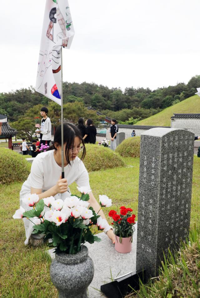 5·18민주화운동 45주년을 맞아 지난 16일 광주 북구 운정동 국립 5·18민주묘지에서 열린 '오월의 꽃이 피었습니다' 행사 중 광주·전남 지역 학생 518명이 민주묘지에 카네이션을 헌화하고 있다. 광주=뉴스1 |
