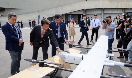 지난 14일 서울 강서구 코엑스 마곡에서 열린 드론산업 얼라이언스 창립총회에 참석한 박상우 국토교통부 장관이 전시중인 방산 드론을 살펴보고 있다. 윤동주 기자 |