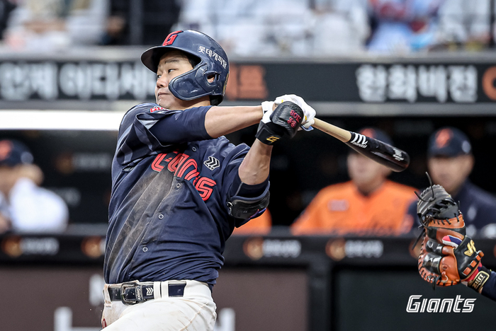 롯데 손호영이 24일 대전 한화생명 볼파크에서 열린 2025 KBO리그 한화전에서 안타를 때리고 있다. 사진 | 롯데 자이언츠 |