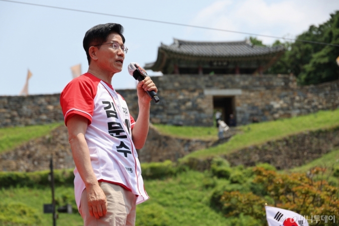 (공주=뉴스1) 김민지 기자 = 김문수 국민의힘 대통령 후보가 25일 오후 세계문화유산인 충남 공주시 공산성 인근에서 유세를 하고 있다. 2025.5.25/뉴스1 Copyright (C) 뉴스1. All rights reserved. 무단 전재 및 재배포, AI학습 이용 금지. /사진=(공주=뉴스1) 김민지 기자 |