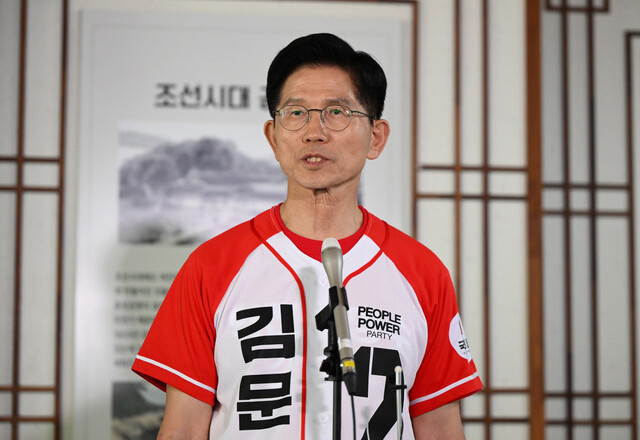 김문수 국민의힘 대선후보가 25일 충남 공주 공산성 앞에서 선거 유세를 마치고 기자들의 질문에 대답하고 있다. 공동취재사진 |