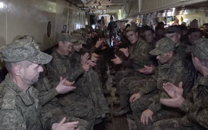 우크라이나에서 풀려난 러시아 전쟁 포로들이 25일(현지시간) 러시아 모스크바 인근 숄코보에 위치한 치칼로프스키 공군 기지에 착륙해 환호하고 있다.EPA연합뉴스