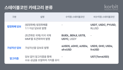 코빗리서치센터가 발간한 '스테이블코인 시대, 우리는 준비되어 있는가' 보고서에 따르면 스테이블코인은 가치 저장 수단과 결제 수단을 넘어 수익형 구조와 실물자산 연계, 다양한 담보 방식 등으로 진화하고 있다. 이에 따라 코빗 리서치센터는 준비 자산과 수익 구조를 기준으로 스테이블코인을 재분류하고 '광의의 스테이블코인'이라는 확장된 개념 아래 대표 자산들을 분석했다.