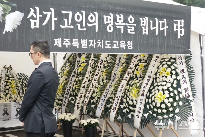 [제주=뉴시스] 양영전 기자 = 23일 오후 제주시 연동 제주도교육청 앞마당에 제주 한 중학교에서 숨진 교사의 분향소가 마련된 가운데 조문객들의 발걸음이 이어지고 있다. 2025.05.23. 0jeoni@newsis.com |